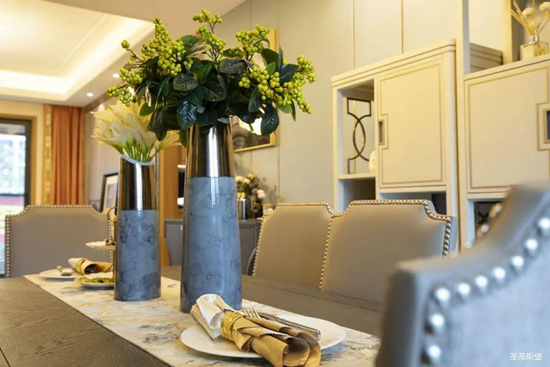 看似傳統(tǒng)實(shí)木的餐桌,細(xì)節(jié)之處卻盡顯輕奢精致格調(diào),高級(jí)灰軟包,原金屬鉚釘嵌入,在體現(xiàn)時(shí)尚感的同時(shí),也提升了用餐的舒適度。