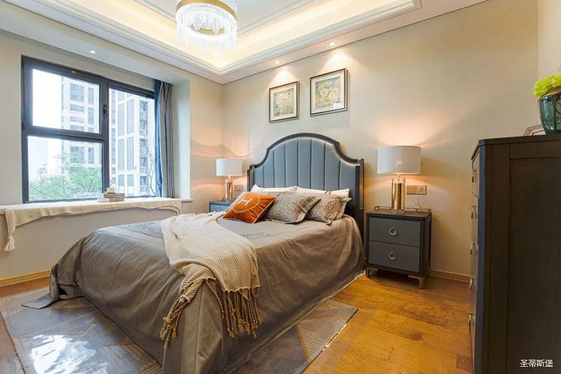主臥的空間鋪敘看似平淡素雅,簡(jiǎn)約垂直線條被實(shí)木包裹,無形中帶來了視覺延伸,時(shí)尚金屬與沉穩(wěn)實(shí)木碰撞,時(shí)尚氣息瞬間溢滿空間。射燈引入柔和暖色光線散落裝飾畫上,賦予空間最溫柔的色彩共鳴。