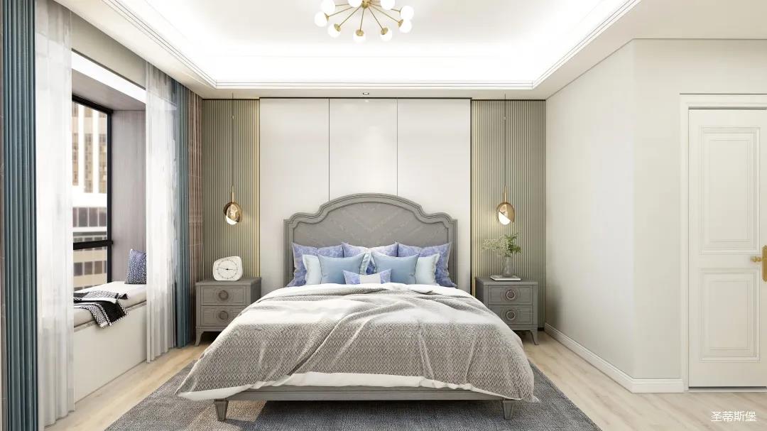 次臥的設計充滿治愈氣息,表姐打算讓兩位老人居住。莫蘭迪灰的實木感經(jīng)典再現(xiàn),沉穩(wěn)中透著時尚,流露出精致的美式格調(diào)。舍棄刻意繁復的設計,簡約米白背景墻與床屏產(chǎn)生的視覺延伸,提升了空間的舒展性。金屬材質(zhì)的燈飾,以較強的白熾燈為主,輔助照明,將對兩位老人的關愛體現(xiàn)在細節(jié)中。