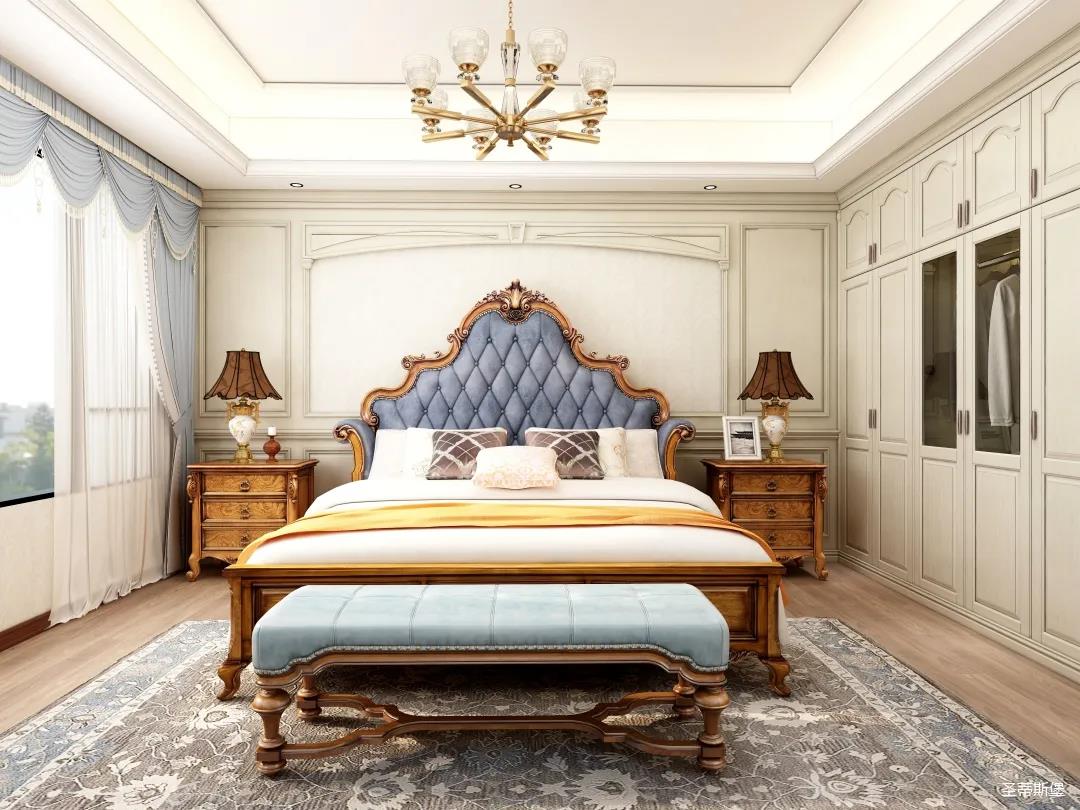 03主臥主臥設計運用現代的設計手法和材質還原了古典氣質,以干練的線條傳達著溫馨的臥房。蜿蜒的波紋曲線,細膩精致的雕花,猶如隨風起伏的浪花,在清澈藍的床屏上跳躍,向靜態空間展示著活躍的動態效果。曲直線條完美融合,打造一個靈動而又精致的生活空間。