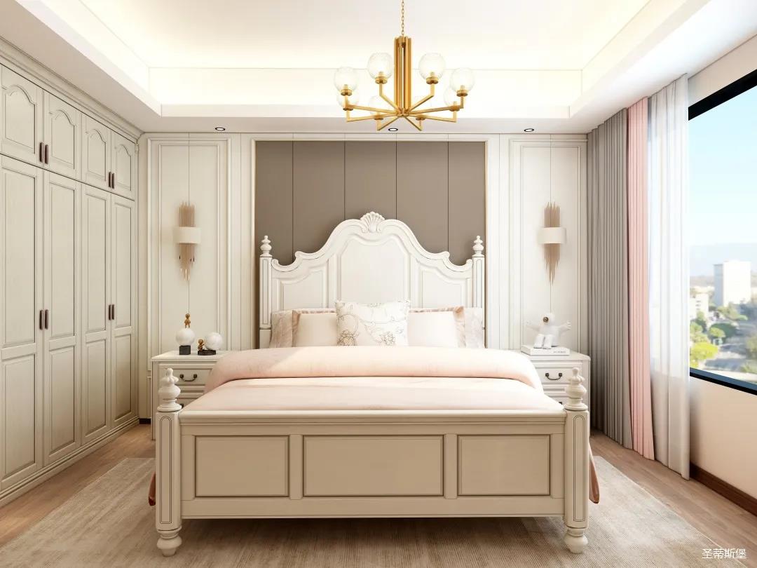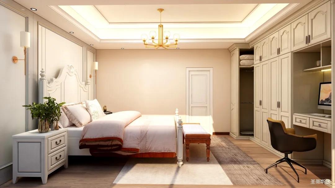 次臥的設計更注重收納,人性化嵌入式書桌,整排衣柜設計有效的利用了空間每一個角落。床屏在保持原有美式家具特色的同時,增加了線條美,將繁雜的雕琢簡化,并融入時尚的美式元素,壁燈,吊燈糅合自然光影,完美呈現出尊貴的空間格調。