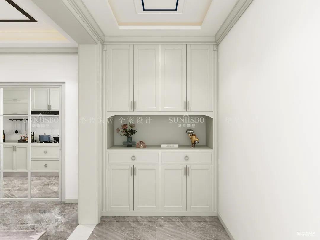 玄關整體遵循了對稱美的設計,仿古白柜體在留白區域的襯托下,產生了若隱若現的隱形美。柜體儲物功能強大,中空部分可以放置入戶零碎物品。貼心的設計讓出入戶隨即變得方便又舒適。