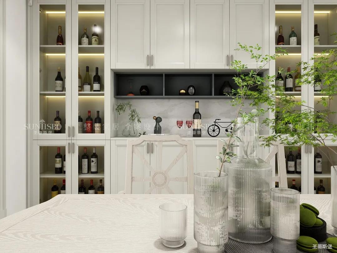 客廳根據業主太太的喜好,以輕奢高級質感為基調,將美式的浪漫氣息融入其中,摒棄了濃墨重彩,在不同材質的點綴下,有的全是自然的氣息,客廳頂面也沒有繁雜的吊頂裝飾,自然光源就足以讓家明亮不少。閑暇之余,在此小酌一杯,好不愜意~