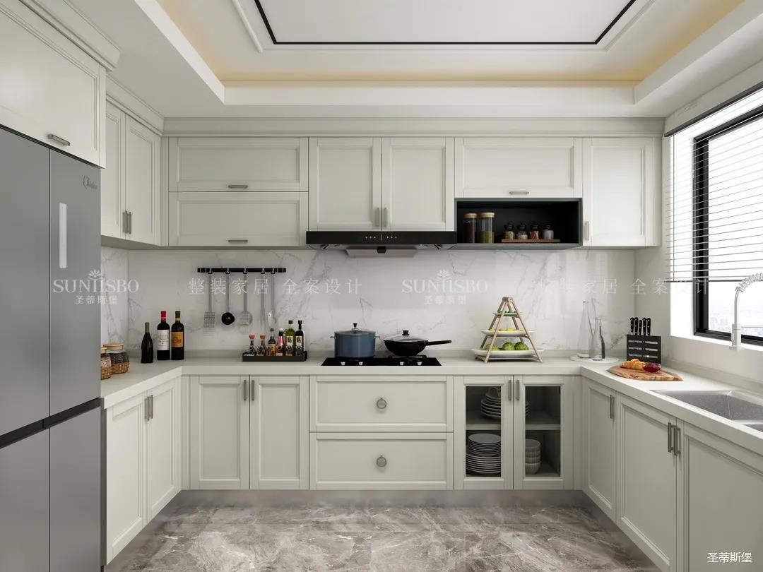 廚房從屋主的飲食習慣出發,運用溫柔的莫蘭迪色彩(仿古白)打開了美式櫥柜定制的新世界!在美式輕奢的基調上,進行線面模塊的靈活組合,在滿足廚房基本需求的同時也將儲物優勢傳達到每一細節處。