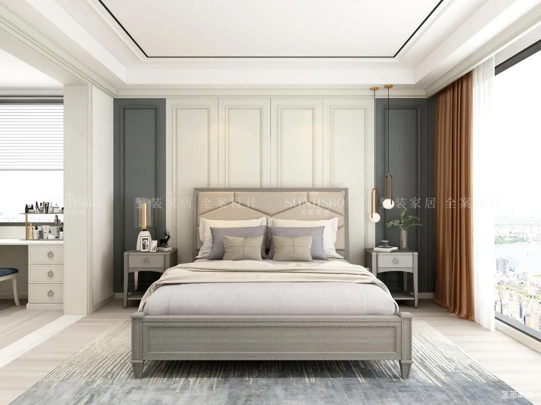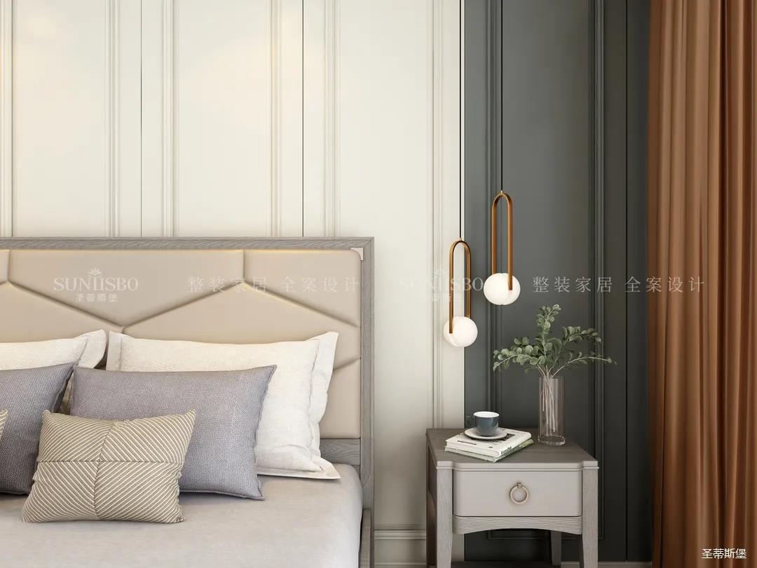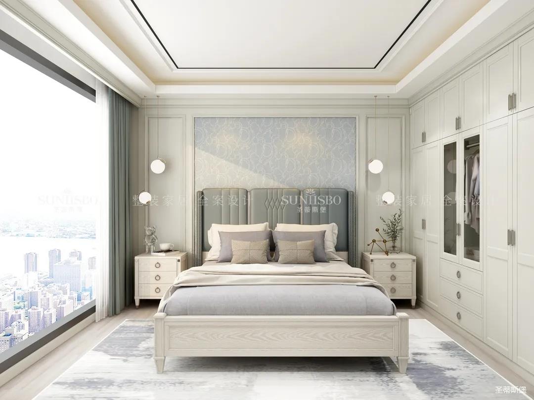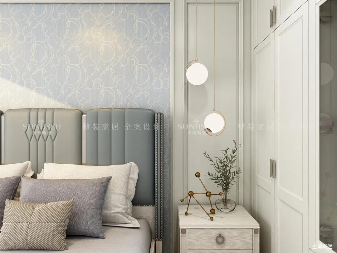 輕盈而明亮的實木飾面與超大落地窗,給次臥空間帶來了明朗的空間視野,莫蘭迪色彩交疊出最時尚的空間底色。定制衣柜對稱開合讓空間秩序規律又齊整,護墻選擇了淺藍色打底,雖是美式風格,顏色卻沒有美式的厚重感,印花貼合著床屏,流線簡練利落,以簡致的維度詮釋著美式雅致的舒適生活。