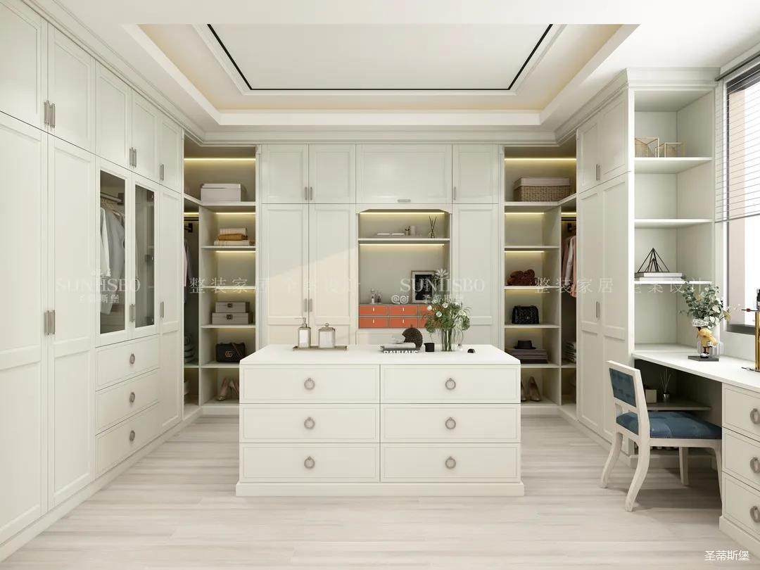 主臥側面就是獨立步入式衣帽間,以仿古白木質紋理布局形成美式輕奢主題,設計模塊化的儲物,散發著濃郁的實木清新感,予人以飽滿而溫柔的情緒,內嵌的智能感應燈帶,讓時尚與輕奢形成輕微碰撞,讓收納力max+的同時也呈現出滿滿的質感。
