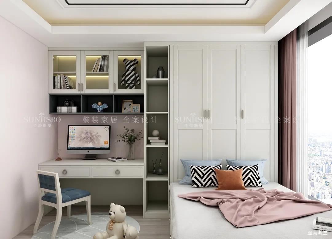 考慮到兒童身體免疫系統尚未成熟,抵抗力相對會較弱,所以空間采用了E0級全實木打造,少女粉墻體與仿古白柜體對應搭配出兒童空間的平衡點,典型的榻榻米+書桌的設計,既保證了足夠的學習區,還兼顧著收納功能。