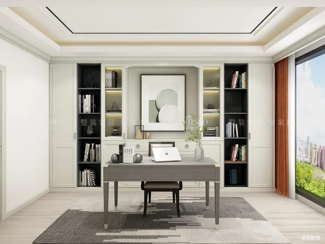 現代書房空間承載著更多的生活方式,它以各種形式出現在家的一隅。休閑之時,一杯清茶,一本書,靠著一張舒適書桌椅即可很好的釋放自己的思緒。書桌背后設計成嵌入式一字型書柜,對稱設計大氣美觀又實用。墻面利用率極高,而且能呈現出更加規整的空間感。