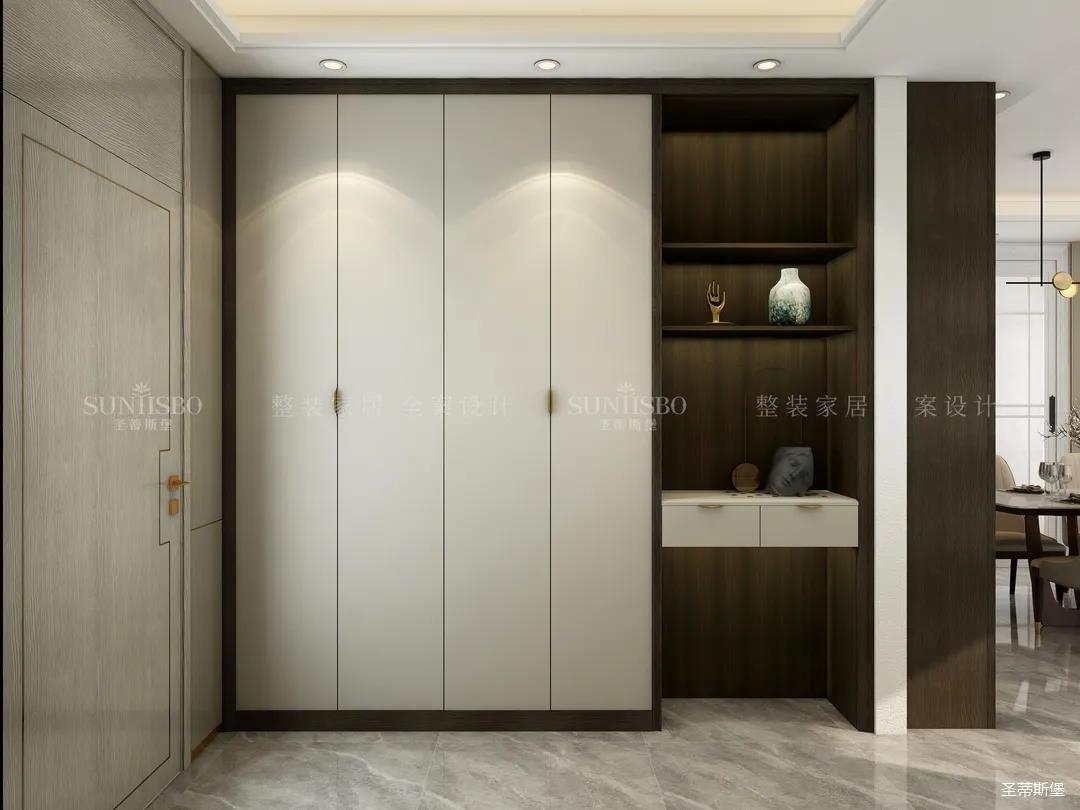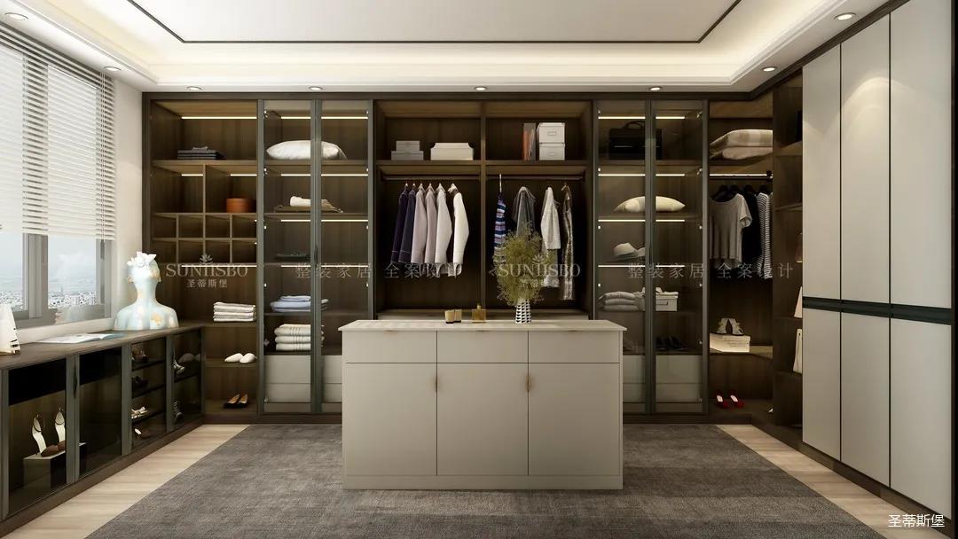 衣帽間采用了虛實(shí)結(jié)合的設(shè)計(jì),構(gòu)筑起規(guī)整而有序的置物區(qū)域和功能齊全的收納系統(tǒng),煙熏色實(shí)木作為空間的主要元素,環(huán)抱著整個(gè)衣帽間,張揚(yáng)又不失沉穩(wěn),恰到好處地搭配金屬玻璃置頂高門和感應(yīng)燈光系統(tǒng),挑高了空間效果,也詮釋著現(xiàn)代極簡(jiǎn)線條美感和對(duì)極致的生活追求。