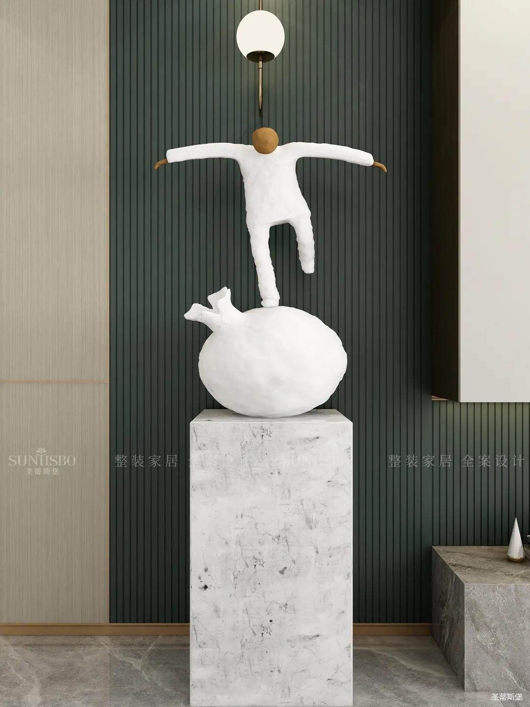 白綠搭配作為當(dāng)下時(shí)尚界的黑馬,一個(gè)沉著冷靜,一個(gè)高級(jí)清新,相互碰撞出前所未有的視覺(jué)享受。純白異型藝術(shù)雕塑是室內(nèi)和諧的體現(xiàn),也讓空間洋溢著趣味性。