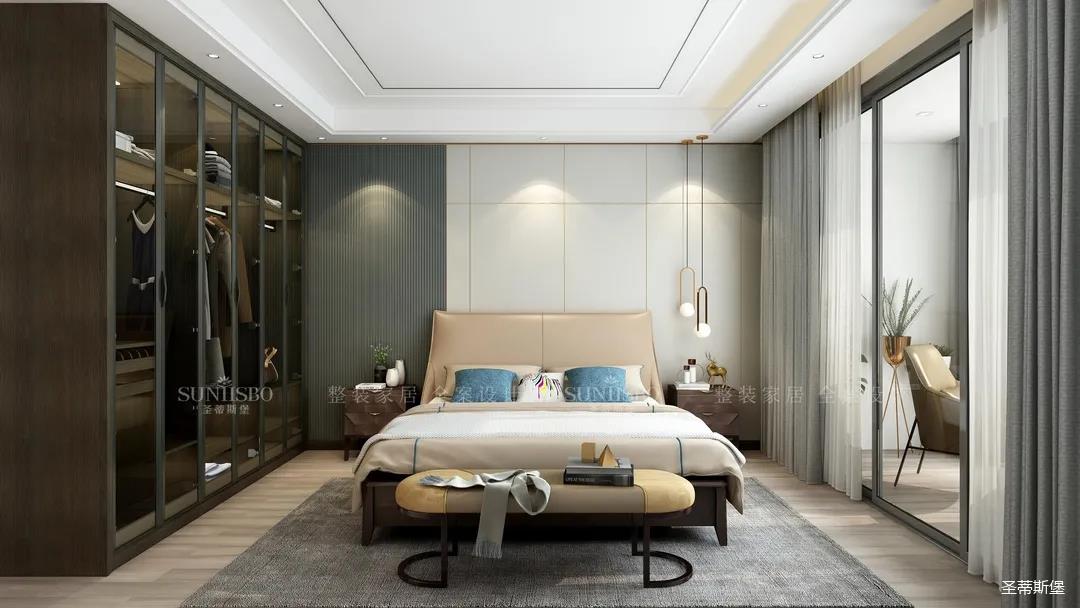 主臥運(yùn)用了大面積落地窗圍合,整體的無(wú)主燈設(shè)計(jì),凸顯了空間極簡(jiǎn)潮流。無(wú)限引入窗外的移動(dòng)光線,輕松為空間注入陽(yáng)光的溫度,u型極簡(jiǎn)金屬懸置著一個(gè)白色造型燈,讓空間從靜謐中生出無(wú)窮的變幻。家具設(shè)計(jì)偏向簡(jiǎn)約舒適,造型雖不奪目,但細(xì)節(jié)質(zhì)感卻能經(jīng)得起時(shí)光的琢磨與品味。