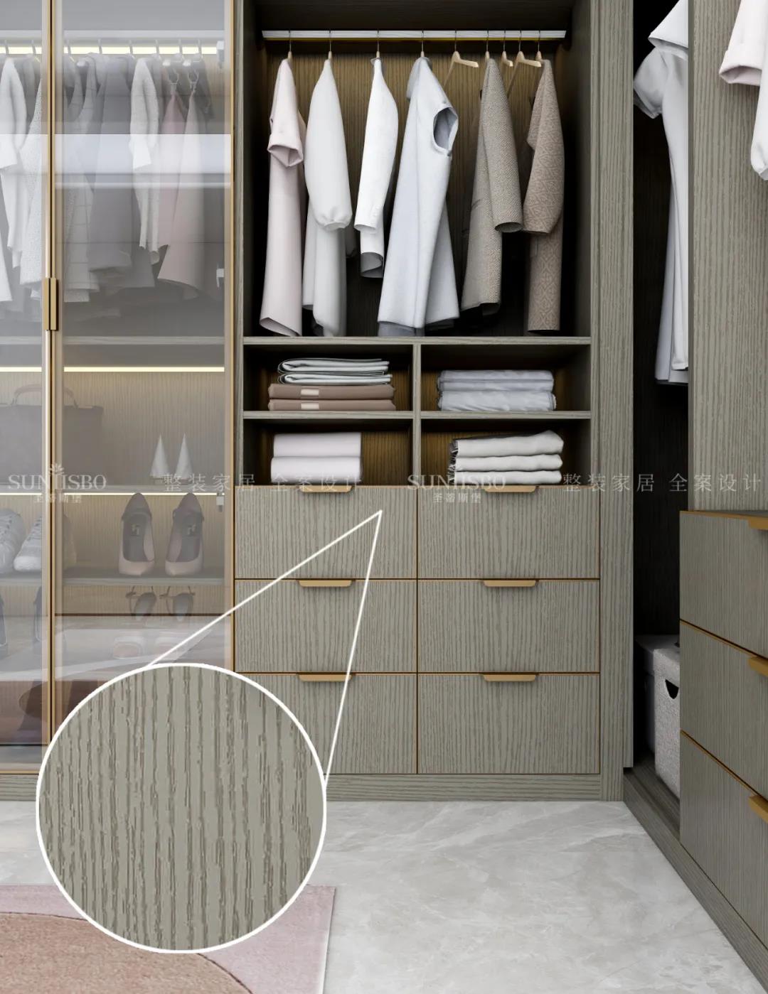 當下人對原生態材質的極致追求也是當下人回歸自然的一個方式,現在很多高端的精裝房墻上都是木飾面,這些木飾面都是貼木皮或者帶木紋的產品,洛斯系列采用紅橡直紋的實木壓紋工藝,使木紋呈現河流的波紋狀,第一可以保持很好的原木的質感的同時,也能夠給空間帶來一種靈動感,不會顯得呆板與單調。由于木面的半開放式涂裝,表面凹凸不平,深淺有致的設計,使產品在燈光下產生漫反射的光線折射,降低了整體產品和空間上的高光感,使人在心理上有更加柔和感受,更加有生活的氣息,就像亞麻質感的面料會讓更多的人接受;與市面上大部分輕奢的鋼琴烤漆相比,鋼琴烤漆的表面是平整光滑的,因此在光線下呈鏡面反射,雖然看起來會有奢華的效果,但是如果放在家里則會給人帶來冰冷與距離感。