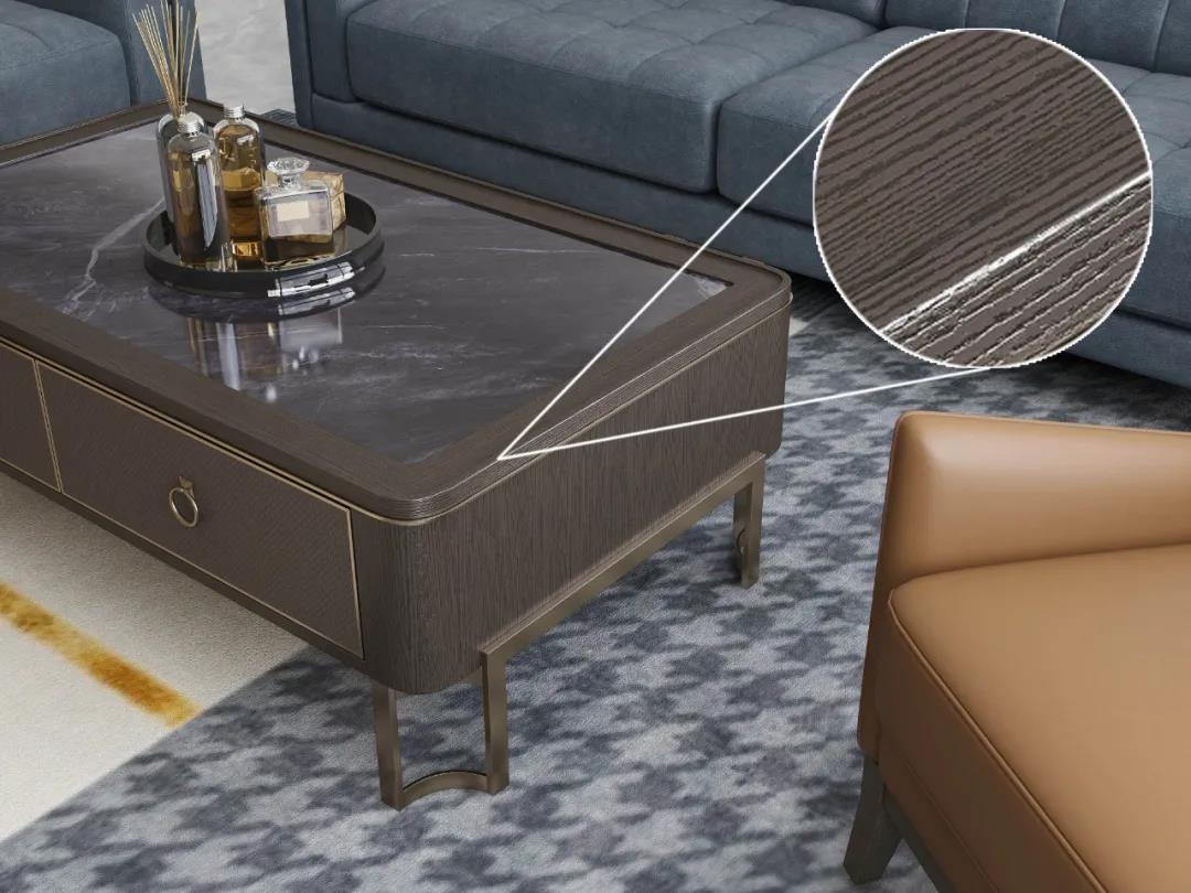 洛斯系列在現代時尚的基礎上還增加了許多輕奢的金屬元素,金屬元素在輕奢風里毋庸置疑的存在。為什么人喜歡戴耳環、戒指、項鏈等首飾?為什么衣服、鞋子、包包上都能看到金屬元素的身影?從時尚圈到家居界,金屬元素憑借其獨特的質感以及由內散發的高級氣質,有著強大的包容性,提升風格格調,增添時尚氣息。運用在家居中可成為整個空間的亮點,成為時下家居裝修的潮流趨勢,深受大家的喜愛。但是目前市面上采用金屬鑲嵌工藝的多數是在板木結合的基礎上,難度相對簡單易操作。在洛斯系列里,是在實木的基礎上進行金屬鑲嵌工藝,要求精準度非常高,誤差不得超過0.5毫米,不然就會對不齊。在洛斯系列中,桌子的四角與腿部、柜類門板,沙發腿部,茶幾支架,餐桌臺面,床品外框等都將金屬恰到好處地融入到空間的每個角落,讓空間擁有輕奢的高級感,提升空間的質感。將優雅謙遜的都市精致感全面呈現,讓裝修冷中帶暖、沉靜精致,也向人們展示了一種精致的生活方式,更為整個家注入靈動氣息。