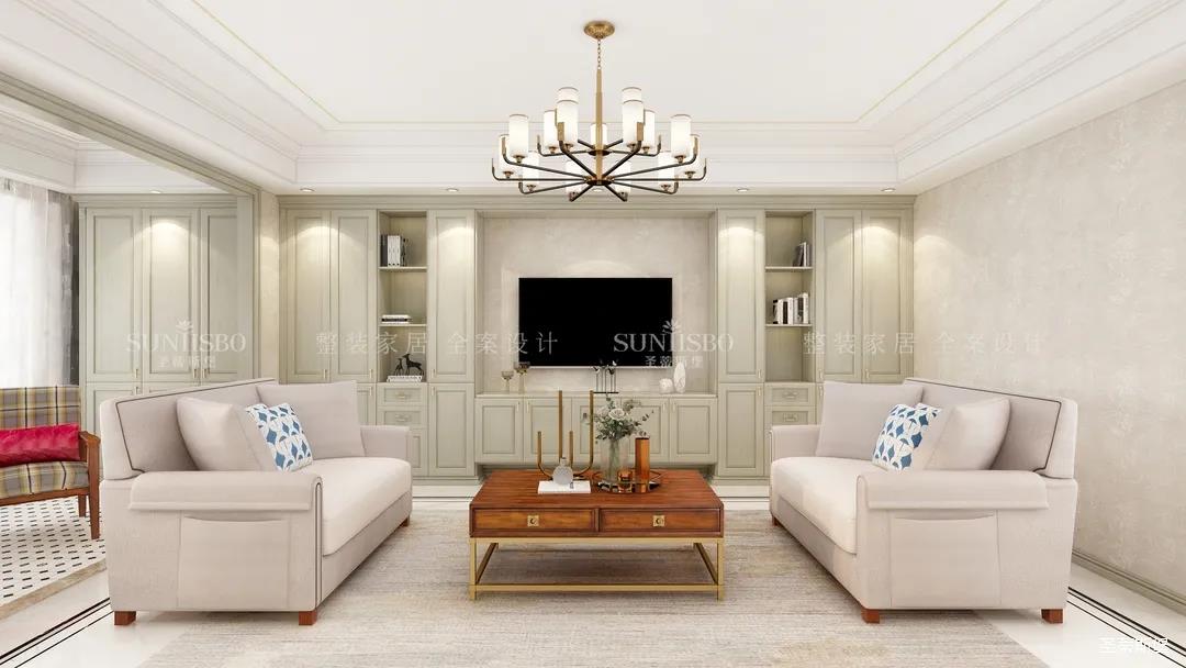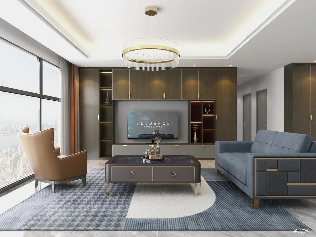 它以英倫爵士灰為柜體主調(diào),背景墻定制了整墻的儲物柜,色調(diào)懷舊復古的同時還夾帶著時尚摩登氣息,明暗收納合理分區(qū),電視被實木飾面包圍,使空間視覺得以延伸,美觀收納兩不誤。