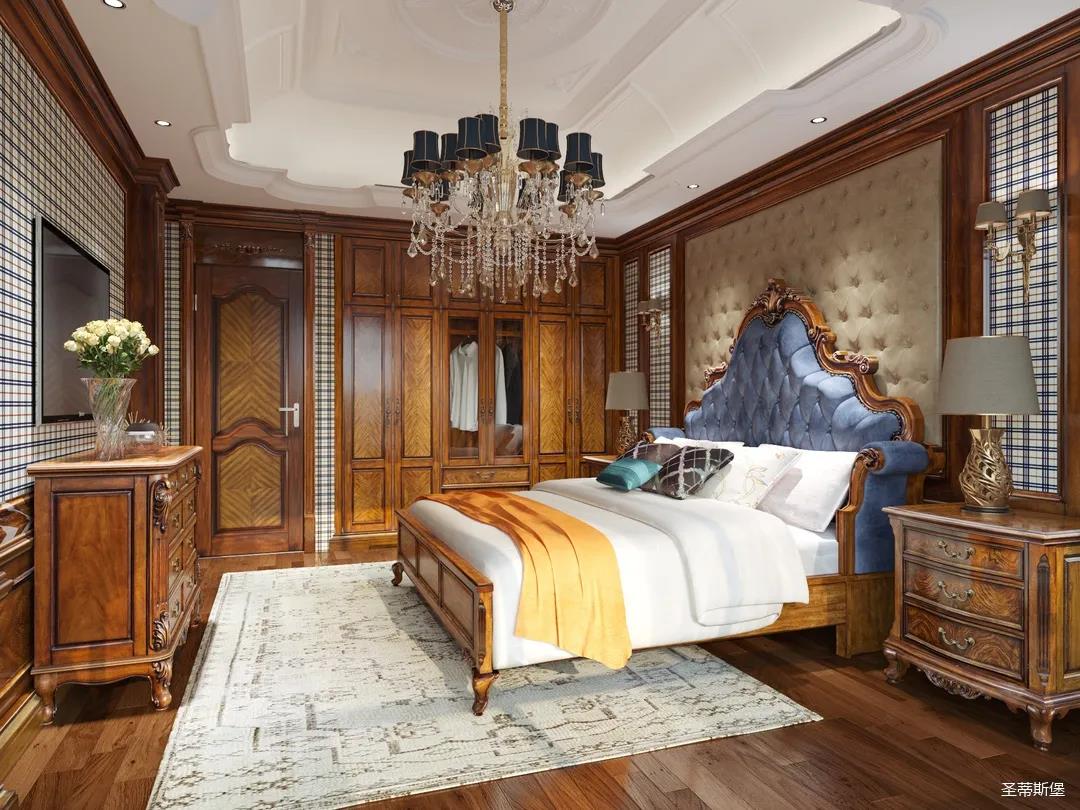 主臥整體設計是美式與現代的完美整合,既保留了純正美式的形和實木雕刻藝術,又具有濃重的美式配色,濃濃的藝術氣息不自覺在浪漫的美式空間流淌。流暢的弧線花飾以及豐富的木作線條別具匠心。大氣穩重與舒適雅致并重,并借由開放的布局、靈活的動線,共同促成了整個空間極具復古浪漫的情調。