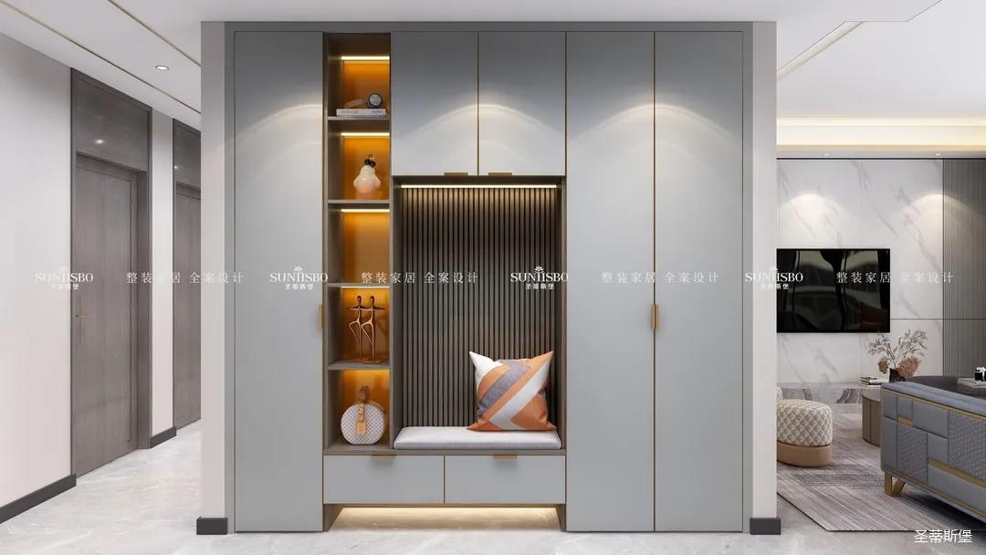 開門即見寬敞實用的玄關柜體。暖黃色的燈帶,不僅增加了室內環境的層次感,更是創造了隱形的光環境。