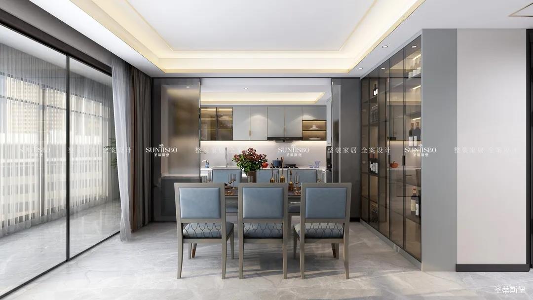 設計師通過對居者在空間中互動關系的細致設想,遵循經典的簡奢風格設計,細膩考究人居與空間關系,反復推敲布局,將客餐廳橫列排布,增加居者的交流互動。