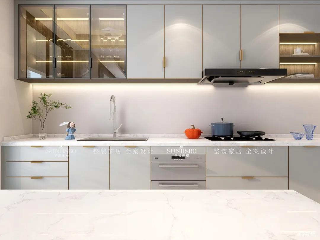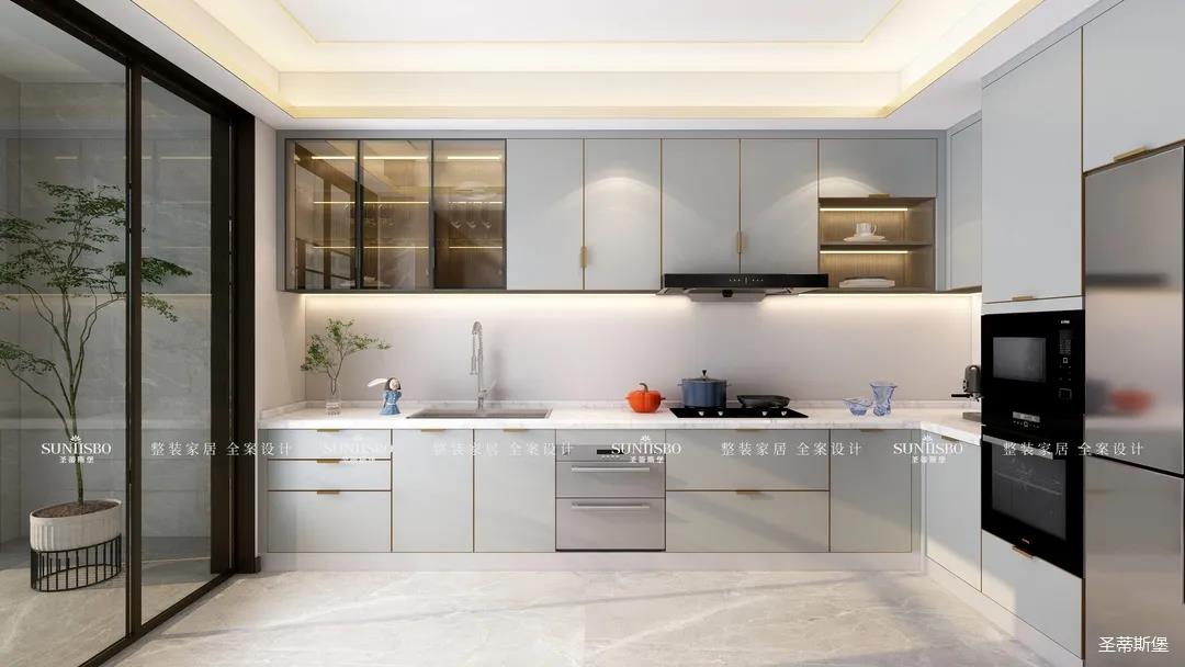 廚房現代智能的設計對精致生活進行了全新的詮釋,同時也呈現了居者追求精簡生活的內涵。智能的廚房電器嵌入同色系的柜體中,時尚科技感十足。