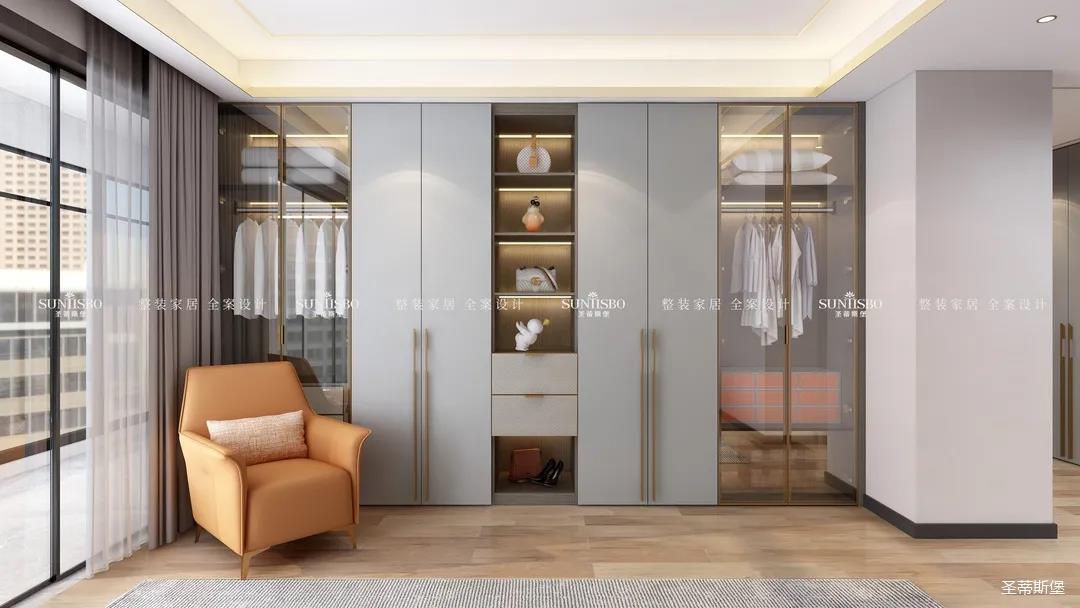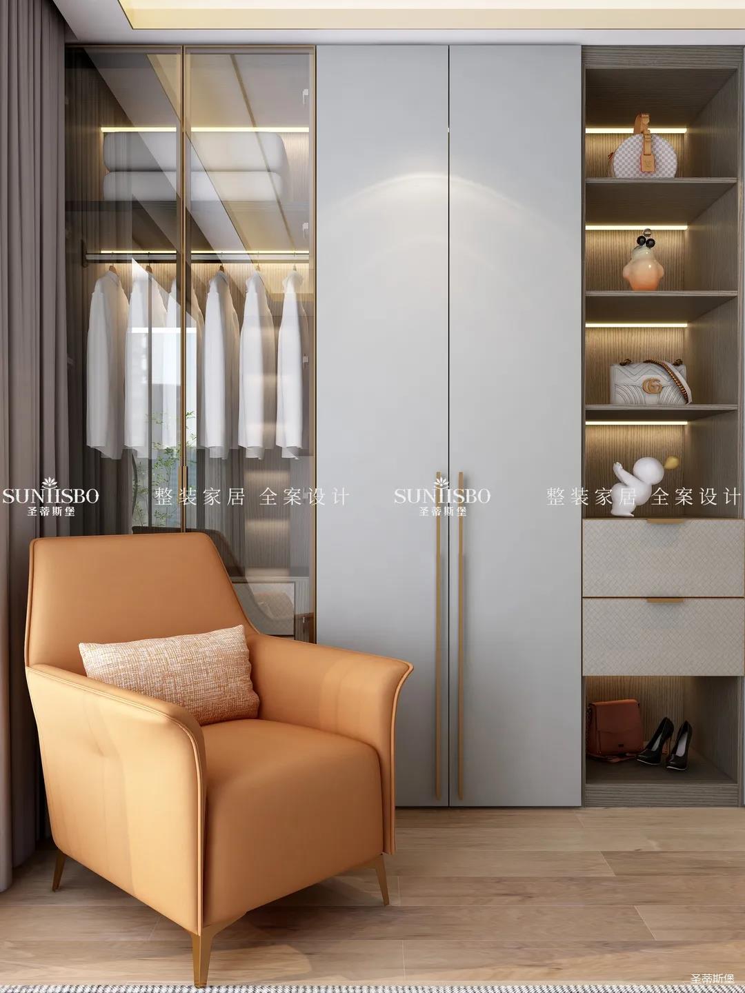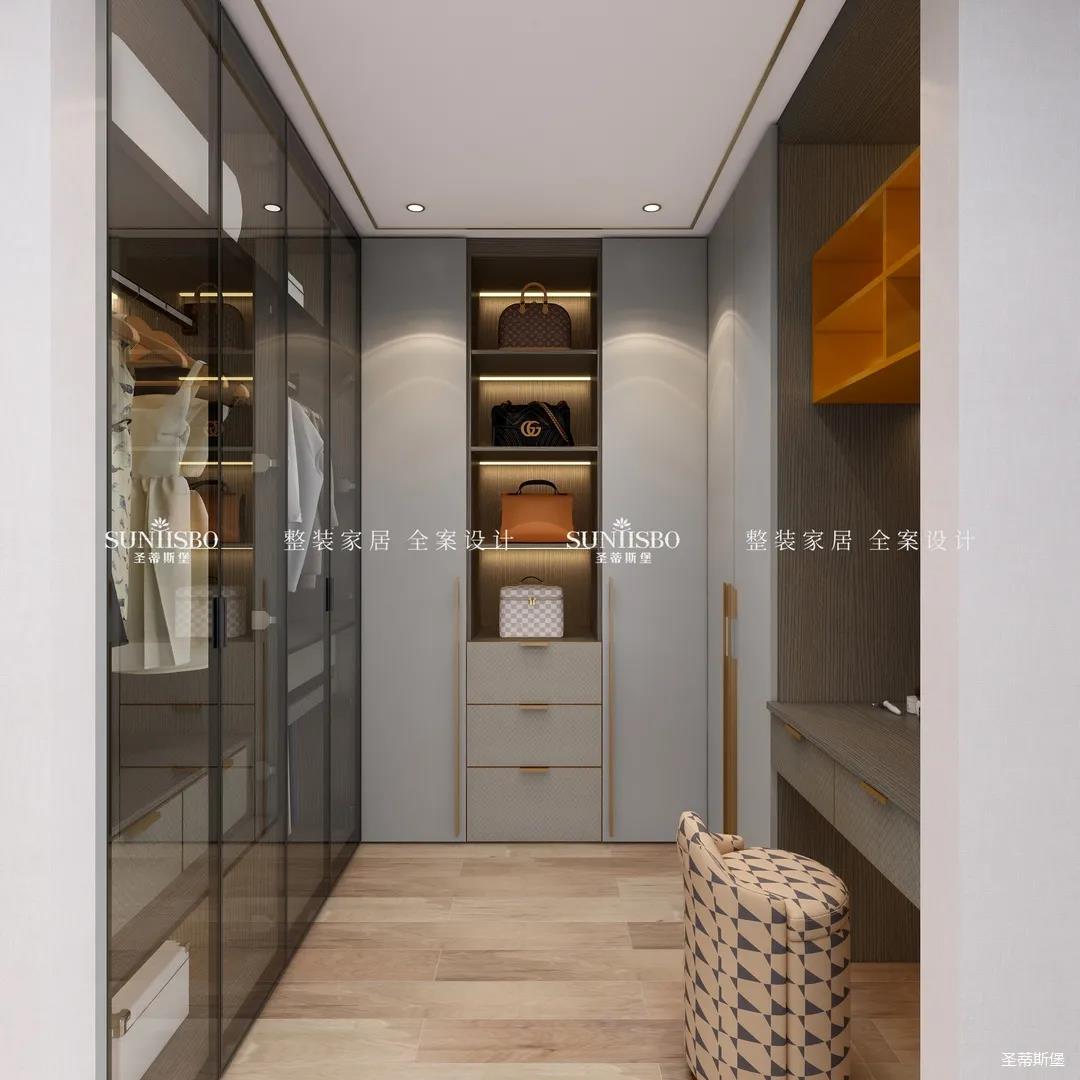 衣帽間選擇淺灰作為空間主色調,設計師在衣帽間用與整體空間相似的愛馬仕橙作為點綴,使空間具有“簡于形,奢于心”的時尚審美內涵。