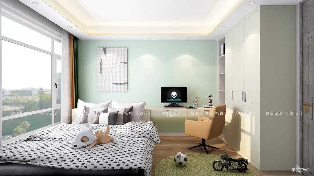 兒童房是清新的淺綠格調,時尚個性又不失溫馨舒適。衣柜與墻體深淺色完美匹配整體硬裝,協調統一。黑白圓點棉質床品與壁畫形成同色系搭配,充盈了空間的飽滿度。
