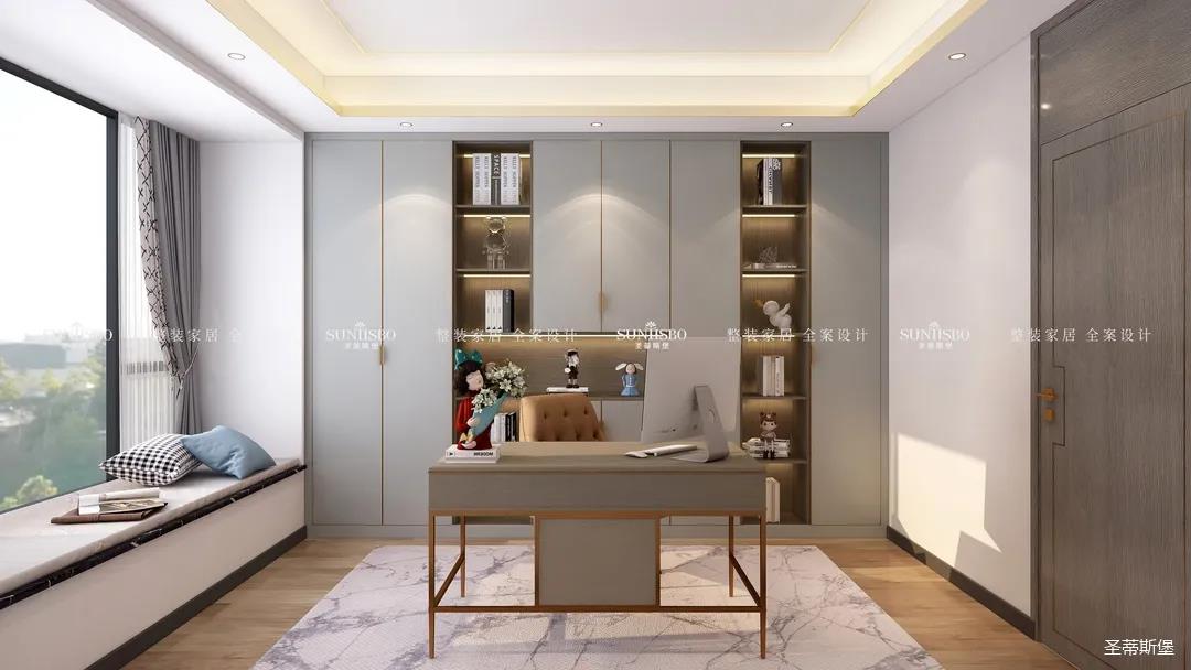 書房以淺灰作為主色調,設計師在整個空間沒有選擇其他顏色進行相互雜糅,讓書房完全釋放了簡約的風格,無主燈的設計理念更是突出了空間層次感。細膩且富有光澤的金屬元素鑲嵌,在繁華的都市中傳遞著特有的文化氛圍。
