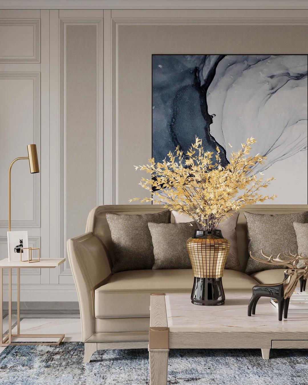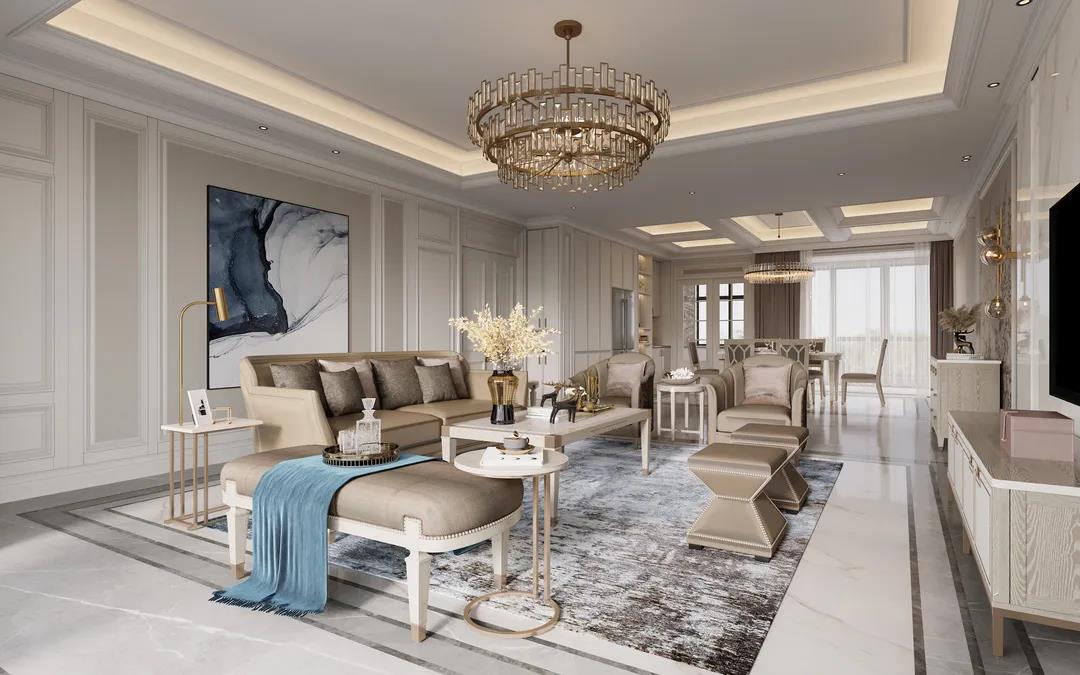 本案定位美式輕奢風(fēng)格,設(shè)計(jì)師提取了業(yè)主喜歡的顏色添加至空間中,并運(yùn)用金屬元素滲透到每一個(gè)空間,統(tǒng)一色調(diào)。在設(shè)計(jì)上,格局大而不空,以優(yōu)美線條雕琢空間語(yǔ)言,材質(zhì)肌理間的碰撞融合,打造出層次豐富的藝術(shù)感。