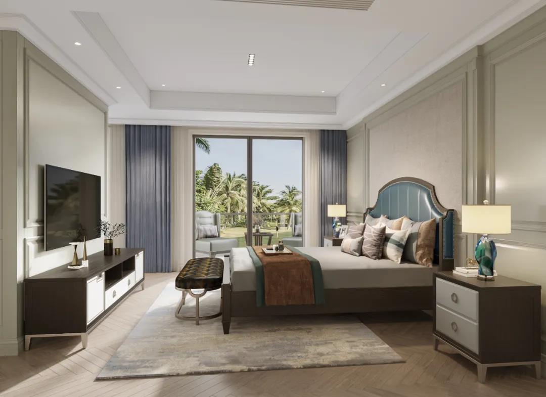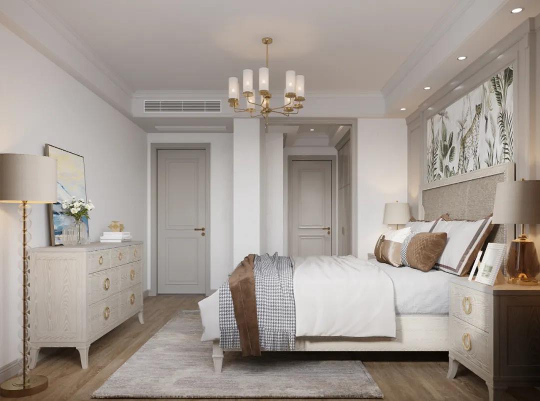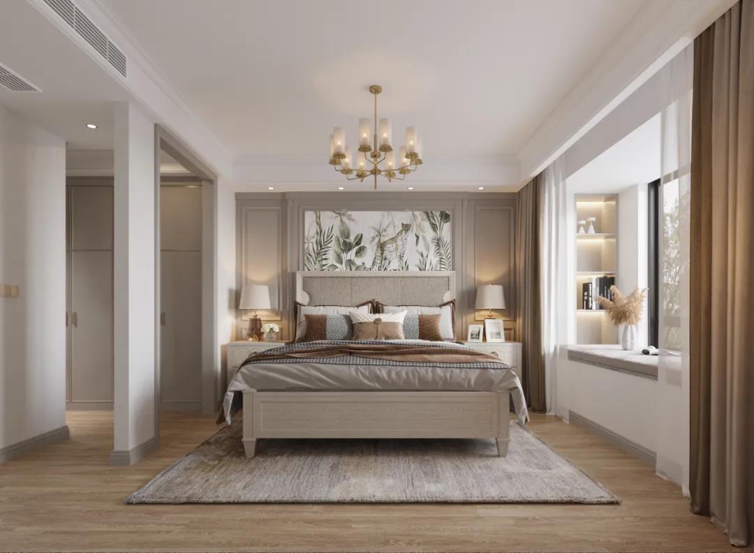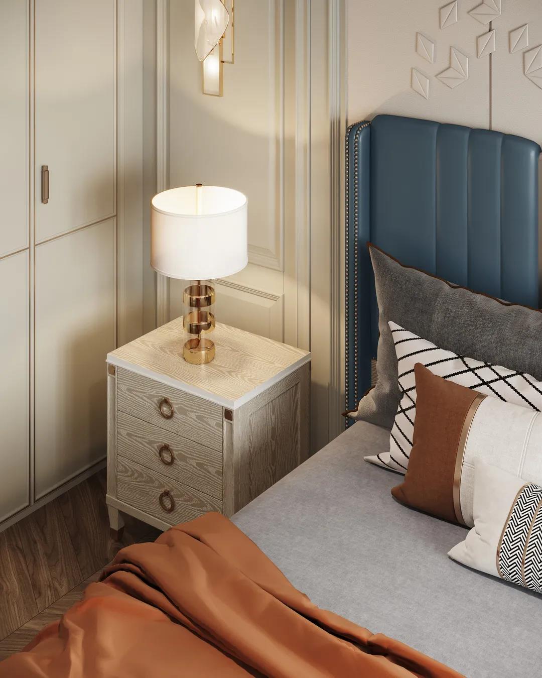 主臥以線條元素做主導(dǎo),軟包的床頭墻面充滿安全感,浮雕的造型給空間布局帶來(lái)了極佳的層次感,以現(xiàn)代美式輕奢框架為主題,融入了美式靈動(dòng)的線條,讓整個(gè)臥室既有時(shí)尚質(zhì)感,又有時(shí)光打磨后的穩(wěn)重。