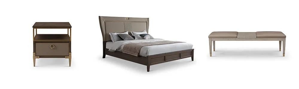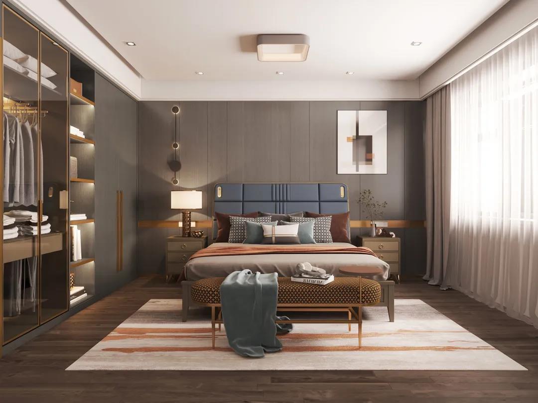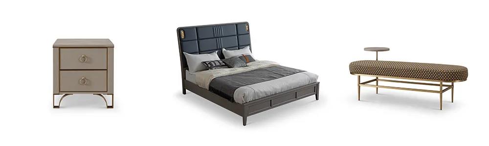 床屏?xí)r尚的霧霾藍(lán)色,與素雅的床品營造出一種低調(diào)的簡奢氛圍。金屬點(diǎn)綴著柜體拉手,床尾凳、床頭柜等微小細(xì)節(jié),讓生活充滿著內(nèi)在涵養(yǎng)與力量。